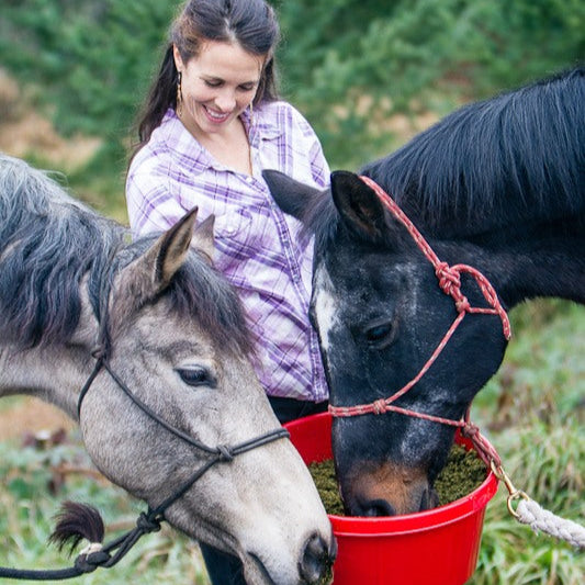I was inspired to create this feed because of my first love, my horse Shadow. He joined our family when we both were 10 years old. Just before his 30th birthday, his teeth were so worn down that he started choking on hay and was no longer able to hold his weight eating just hay. I needed to add calories with something easily digestible but also had a high nutrient value to support his aging body. The senior feeds on the market contained undesirable industry by-products such as peanut hulls, soybean meal, beet pulp, rice bran as well as sweeteners and synthetic nutrients.